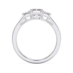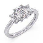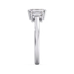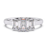A sleek emerald cut centre diamond enhanced by two matching side stones in tiger prong setting for a luxury architectural look.