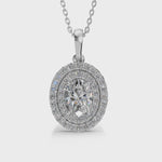 Make a luminous impression with the Aurelia Double Halo Pendant—a captivating solitaire that blends modern sophistication with timeless brilliance. At the heart of this design lies a graceful 1.04 Ct oval lab-grown diamond (8.1mm x 5.8mm), encircled by two radiant halos of precisely set round-cut lab diamonds, totaling 0.53 Ct. Together, they form a symphony of sparkle, enhancing depth, presence, and light play.
