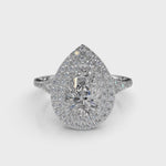 The Celestara Ring is a stunning blend of passion and precision—featuring a 1.57 Ct lab-grown diamond setting where a pear-shaped center stone (8.6 x 5.6 mm) is wrapped in a double halo of round white lab diamonds, cascading into diamond-studded shoulders for a look that’s both bold and romantic.