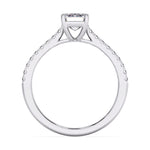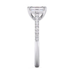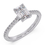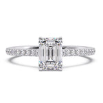 A sophisticated solitaire ring showcasing a 1.00 Ct emerald cut F-VS lab grown diamond, paired with shimmering split pavé accents for graceful elegance.