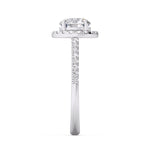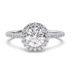 A radiant round brilliant 1.00 Ct lab grown diamond ring, beautifully complemented by fine split pavé diamonds to create a royal, glowing appeal.